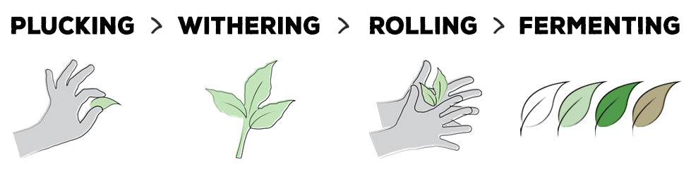 All teas are plucked then withered but it’s what happens next, and specifically how much the tea is allowed to ferment, that determines what type of tea it becomes. Fermentation (sometimes called “oxidation”) is what happens when air is allowed to get to the leaf. Generally, the longer a tea is left to ferment, the stronger (and darker) it becomes; black teas are teas that have been fully fermented so they are strong and taste nice with milk, whereas a green tea is heated to stop it from fermenting, keeping it lighter in colour and flavour.